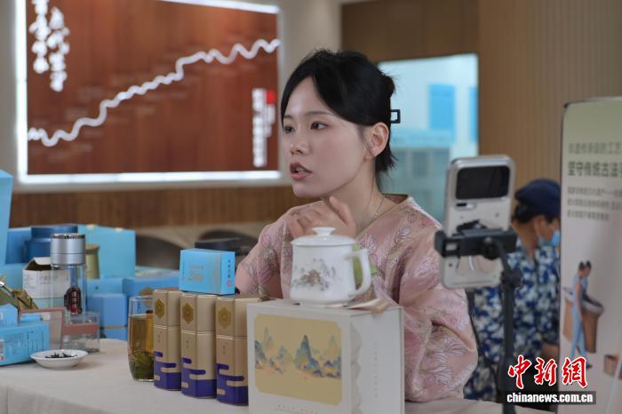 4月14日,正在位于年夜别山区的安徽省6安市的1家茶企内乱,任务职员正正在曲播售6安瓜片。6安瓜片是华夏10年夜实茶之1,也是绿茶家眷中唯独无芽无梗、由单片死叶造成的茶。中新社记者 弛强 摄