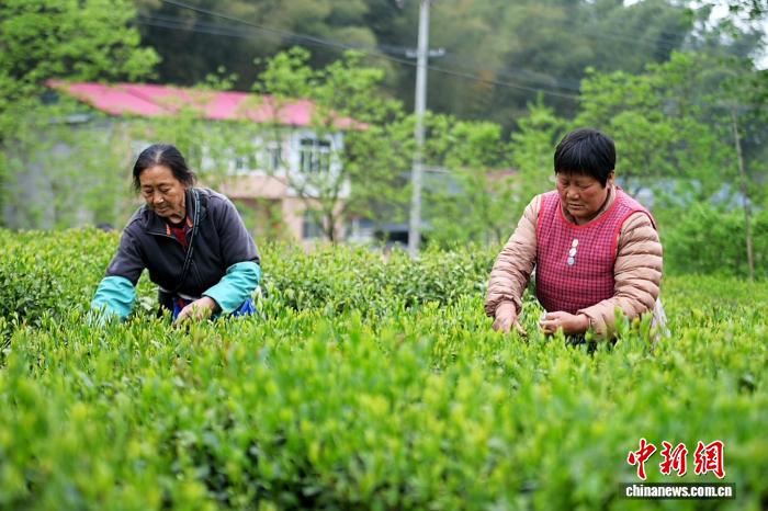 4月14日,安徽省6安市裕安区独山镇单峰村村平易近正在6安瓜片中心产区采茶。6安瓜片是华夏10年夜实茶之1,也是绿茶家属中独一无芽无梗、由单片死叶造成的茶。中新社记者 弛强 摄